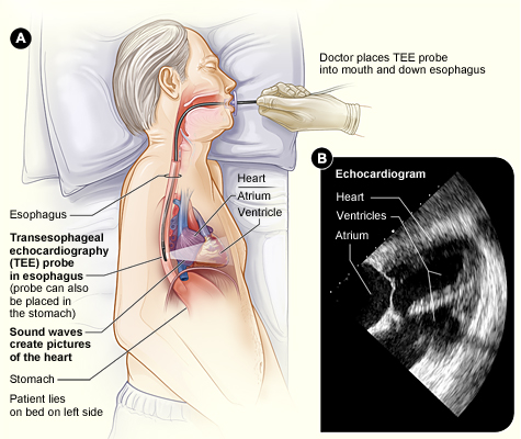Transesophageal echocardiography (TEE) is a test that produces pictures of your heart. TEE uses high-frequency sound waves (ultrasound) to make detailed pictures of your heart and the arteries that lead to and from it. Unlike a standard echocardiogram, the echo transducer that produces the sound waves for TEE is attached to a thin tube that passes through your mouth, down your throat, and into your esophagus. Because the esophagus is so close to the upper chambers of the heart, very clear images of those heart structures and valves can be obtained.
